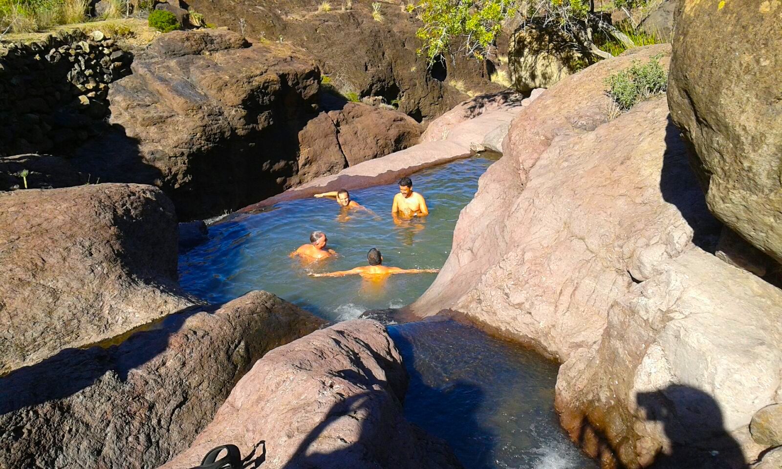 Itinerario: Degollada de La Aldea – Camino Anden Ancho –Laurelillo – Cortijo de Inagua-Casas-Cuevas de La Peregrina- Degollada de Jineto – Barranco de los Lirios – Degollada del Escobón – Montaña de las Toscas – Cañada del Almácigo – Montaña de La Fuente (996 m.a.); retroceder hasta cabecera del barranco de Pino Gordo – descenso del mismo pasando por cascada de SantaJuana, cruz del piloto, casas de Pino Gordo- Cruz del Paso – Camino Llano de Las Huesas – Los Cercadillos – centro urbano de La Aldea.