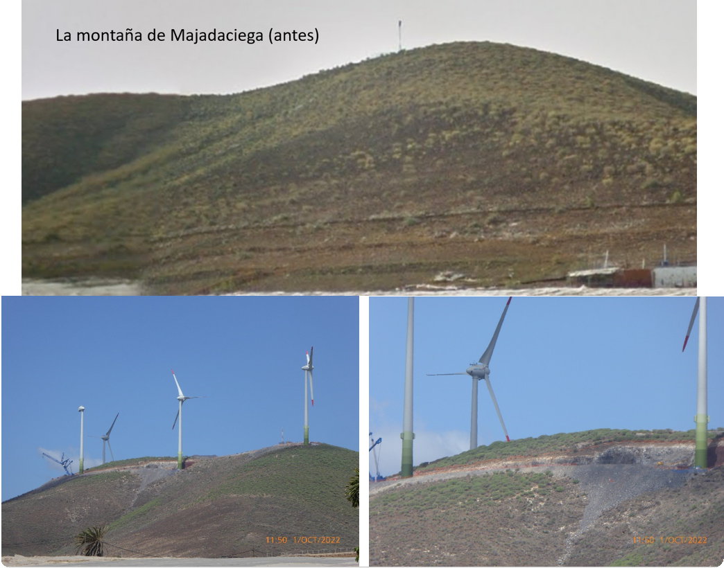 Uno de los primeros ejemplos llamativos por su impacto y ausencia de consideración es el parque eólico que se ha construido en la Montaña de Majadaciega o Masiega (denominado «Parque Eólico Los Nicolases de 6,9 MW en Majadaciega y Barranco de Balos» promovido por Gas Natural Fenosa Renovables, S.L.U.) que fue sometido a información pública en marzo de 2017. Varias personas se han puesto en contacto con nosotros alertados por el impacto que genera este Parque Eólico, y esto es sólo la punta de lanza de lo que se viene encima con Parques Eólicos en lugares emblemáticos y alejados de las demanda de energía eléctrica como La Pasadilla o el Campo de Volcanes de Rosiana y Altos de Jarcó.