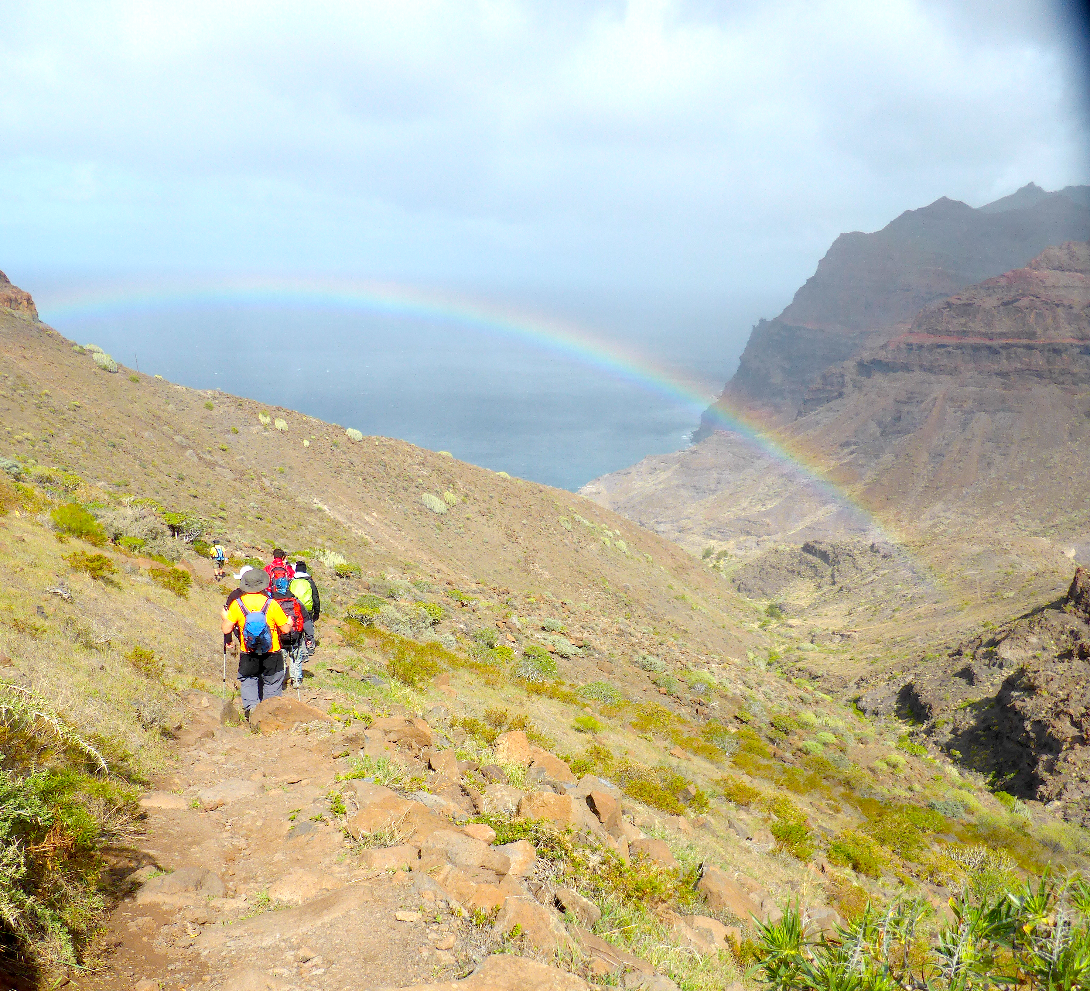 Día frio, muy variable y cambiante que nos ofrecía momentos de sol y lluvia. Guguy nos recibió a las 10:30 horas con un precioso arco iris. Sin embargo el viento predominante con rachas de más de 70 km/h fue una constante, que en algunos momentos hicieron temer por el desarrollo completo de la ruta.