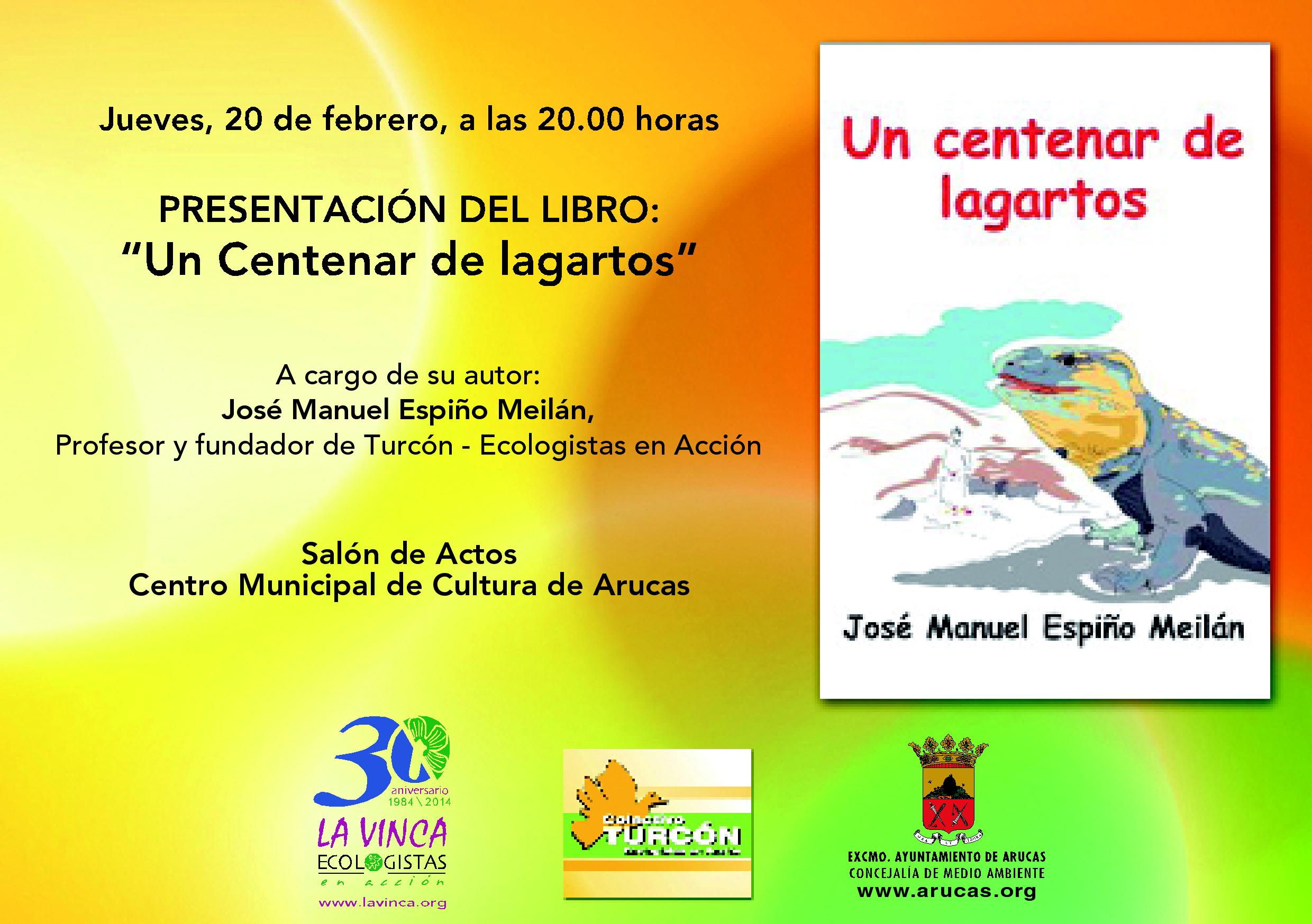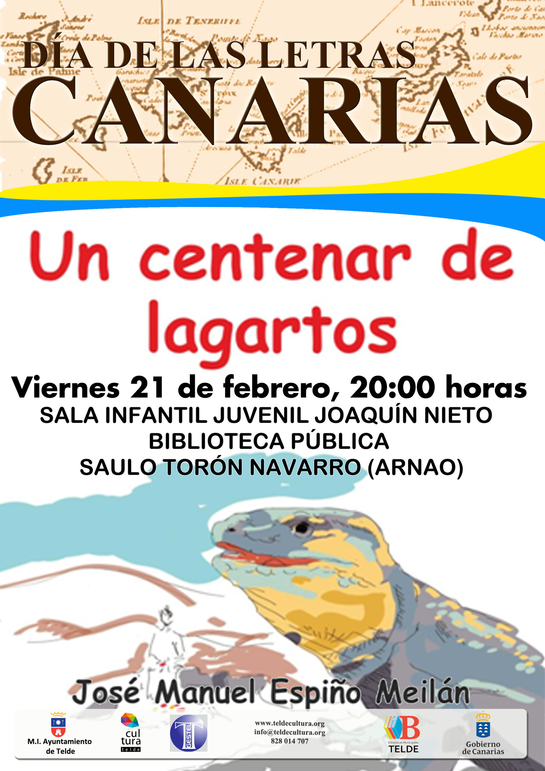 El profesor, educador ambiental y escritor José Manuel Espiño Meilán hace doblete y presenta su último libro “Un centenar de lagartos”, el jueves 20 de febrero a las 20:00 horas, en el salón de actos del Centro Municipal de Cultura de Arucas; al siguiente día, viernes 21 de febrero a las 20:00 horas y dentro del ciclo “Día de las letras Canarias”, en la Sala infantil-juvenil Joaquín Nieto de la Biblioteca Pública Saulo Torón Navarro (Arnao) de la Ciudad de Telde. El autor hará una reseña de su obra y departirá con los asistentes a dichos actos.