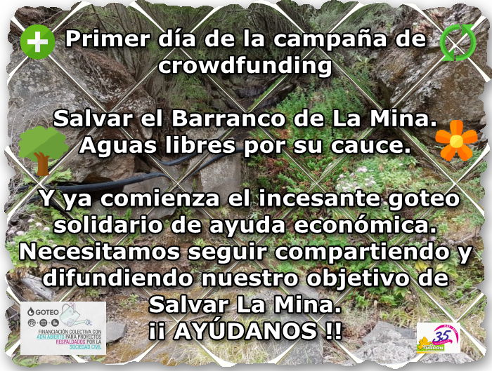 Los objetivos de la campaña es la consecución de la cantidad propuesta para el pago de la sanción, sin menoscabo que sigue intacto el esfuerzo y compromiso de seguir luchando por los valores naturales de este barranco como venimos realizando desde hace años, tanto desde la denuncia institucional como en la personación en juzgado y fiscalía. Como podrán ver en los expedientes que se anexaran a esta plataforma, las denuncias, apelaciones, demandas y demás escritos son múltiples y siempre con la misma finalidad, Salvar el Barranco de La Mina y conseguir que sus aguas bajen libres por su cauce.