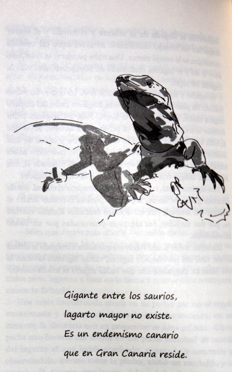 Es ver la dimensión temporal del ser humano, cuando observa el lagarto, para el lagarto de Gran Canaria el humano es un ser inmortal, pasan diez años de su vida, que es la media de vida de este reptil, y ve que el humano no envejece. Sin embargo, el inmortal para el ser humano, va a ser el cardón, que puede vivir doscientos o trescientos años, que es donde se esconde en las raíces el lagarto. Y, curiosamente, cuando desaparecen los tres, porque el libro tiene, en los últimos capítulos, una trascendencia muy larga del tiempo, quien hace la reflexión es la montaña, donde vivían ellos. Y se dan cuenta que los seres orgánicos que habitan la montaña, son tremendamente efímeros, porque no viven nada, dice la montaña: apenas un milímetro de erosión han erosionado el viento y el agua en mí, y estos seres han desaparecido y hay otros.